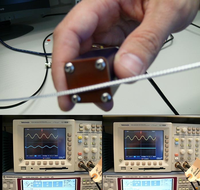 Pascal treated me to a quick demo of how Crystal's shielding flatlines externally applied RF and magnetic influence [right monitor's green line] whereas generic cable demonstrably does not. |